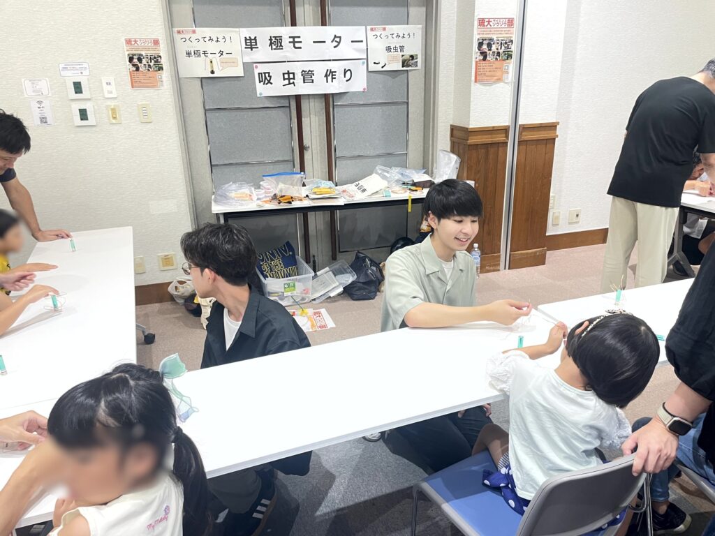 7月26日(土)、うるま市いちゅい具志川じんぶん館で開催された、じんぶん自由大学イベント「科学の自由研究まつり」に、理学部物質地球科学科の前野昌弘先生と研究共創機構の東江あやか先生が「単極モーター実験観察ブース」を出展しました。科学への興味関心の高い子どもたちがたくさん集まり、家族と一緒に実験を楽しんでいました。